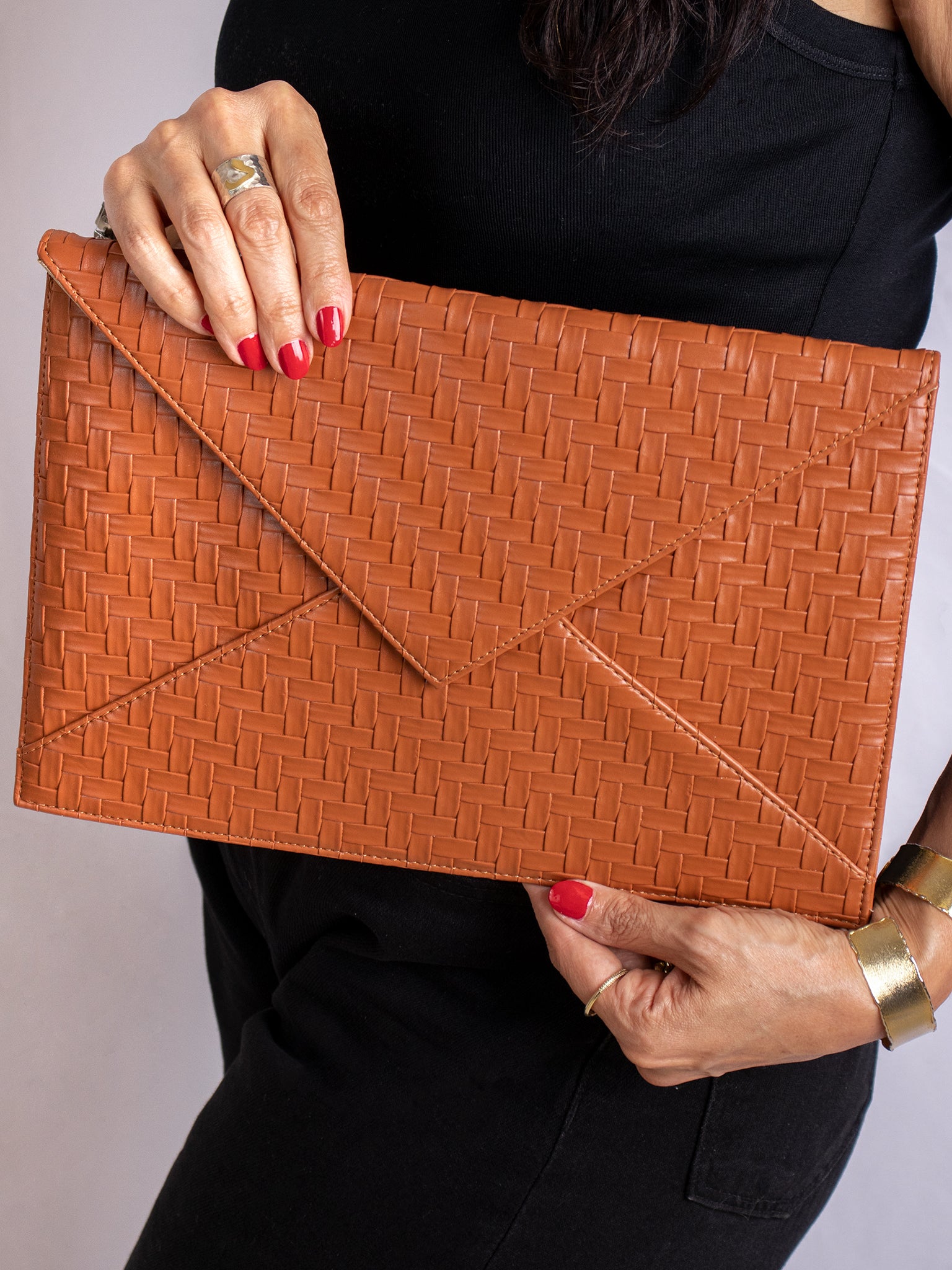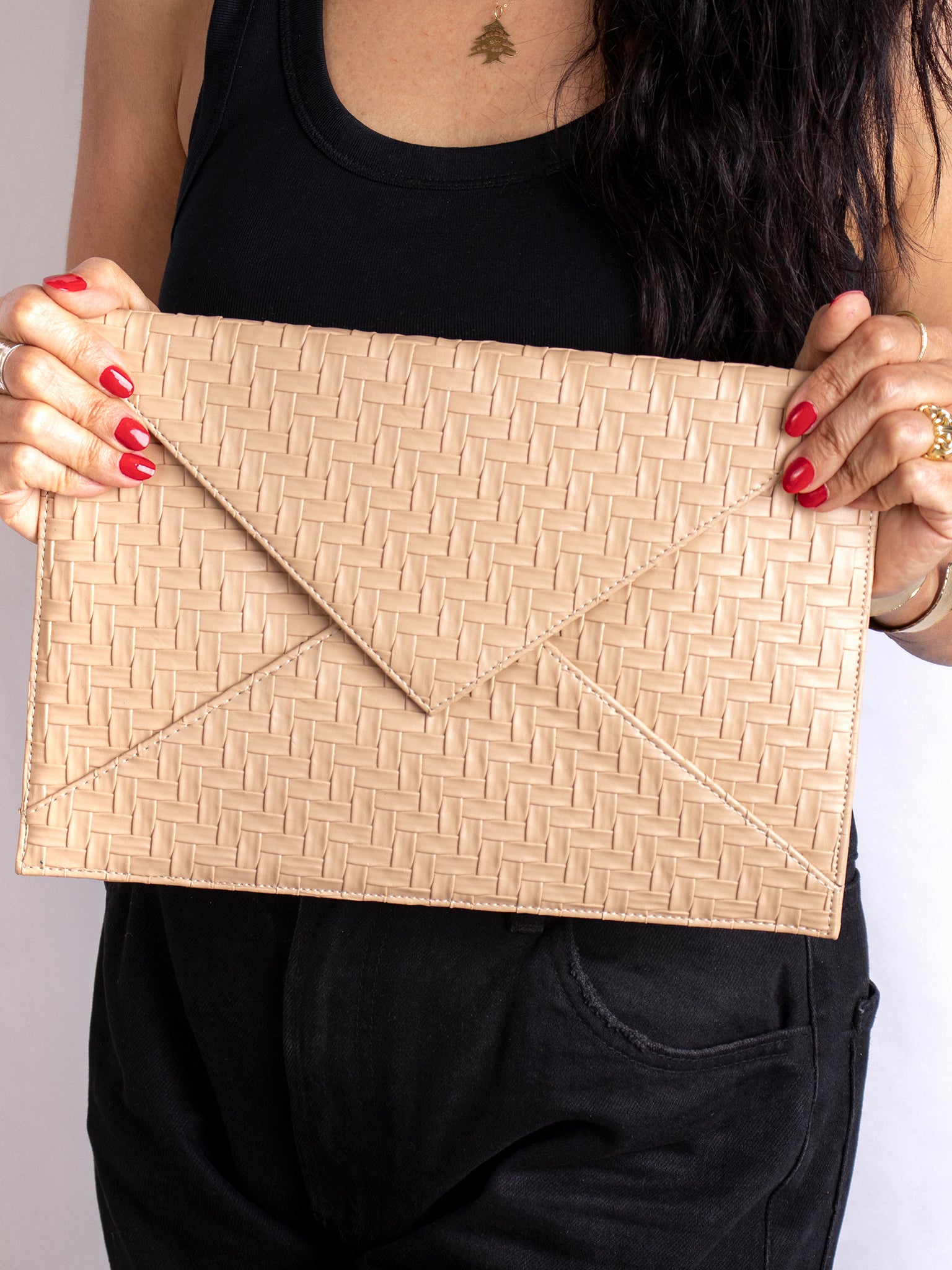 A sleek 32cm envelope-style clutch from textured vegan leather. Features a magnetic flap closure, fabric lining, and an optional chain strap for versatile styling.