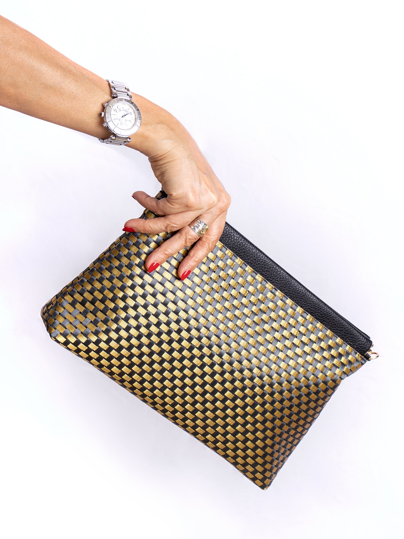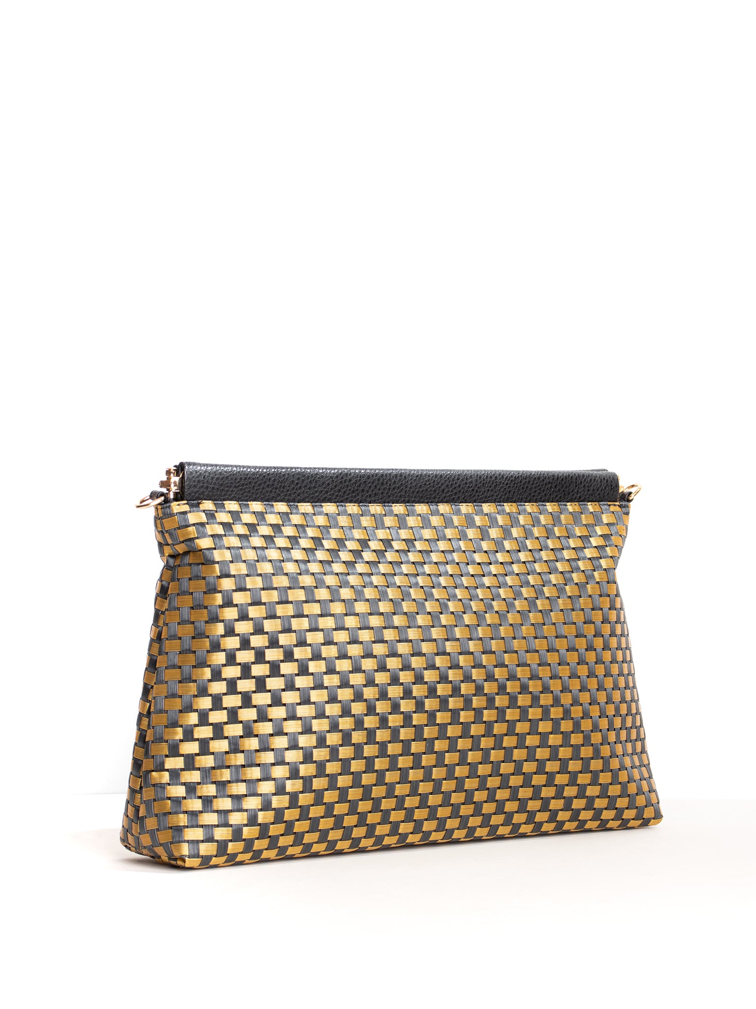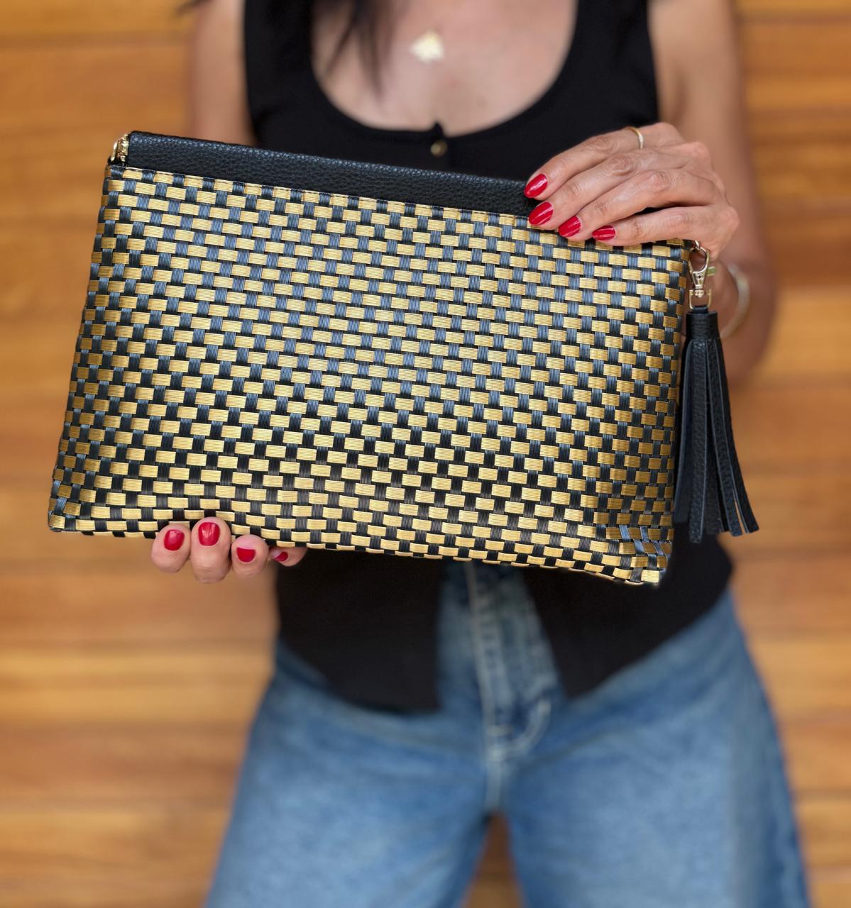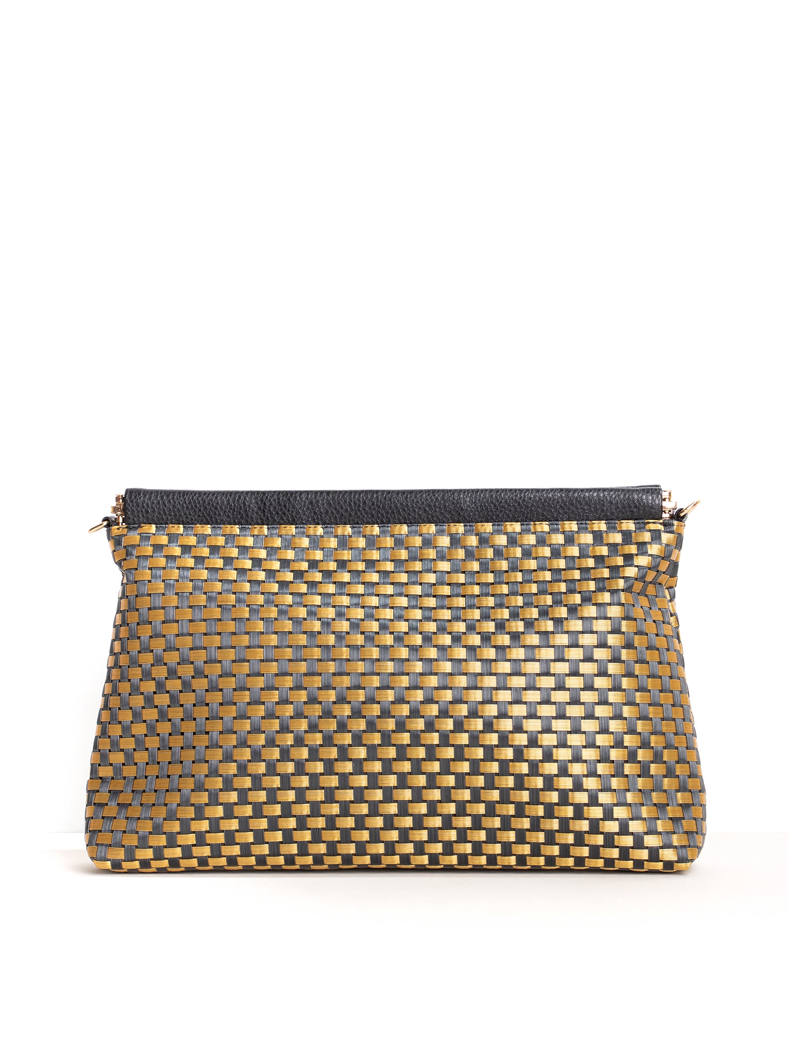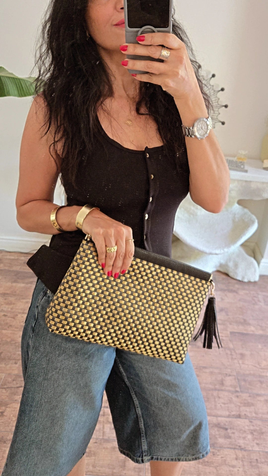 A statement piece crafted from woven gold and black metallic mesh, combining structure with shine. Designed with invisible hardware for a sleek, seamless finish and accented with a side tassel for a touch of movement.