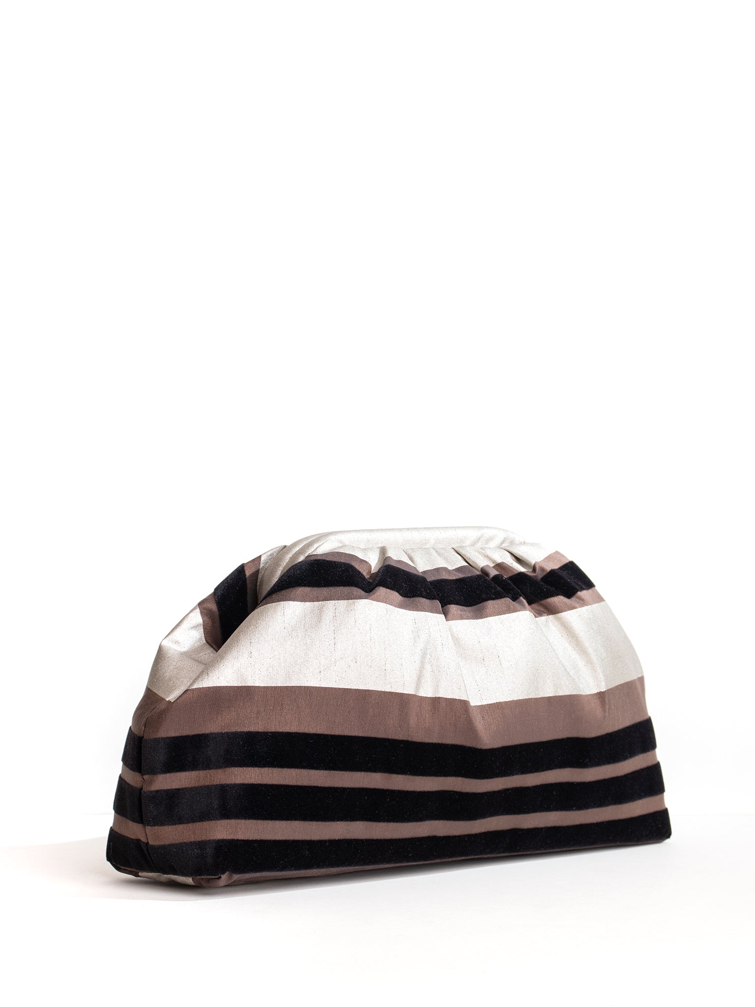 Elegant black velvet meets soft silver and brown satin for a refined, modern look. With inner pockets and a zip compartment to keep your essentials in place.
