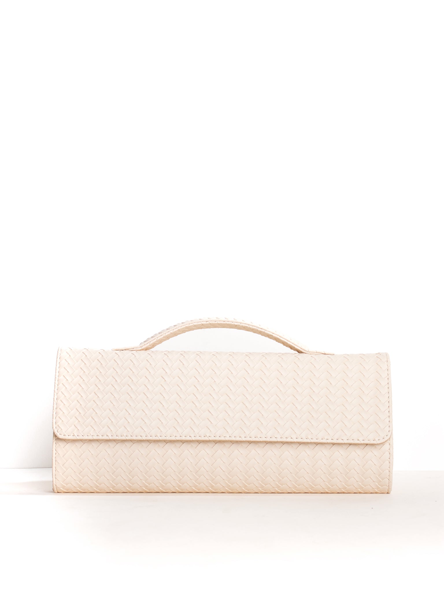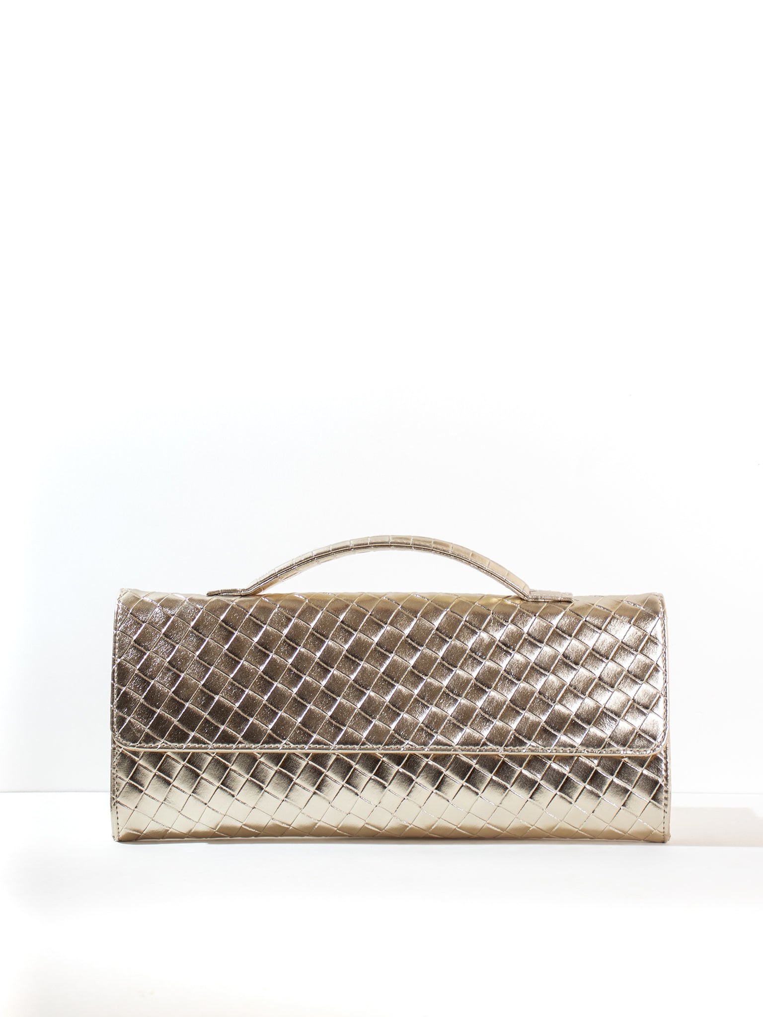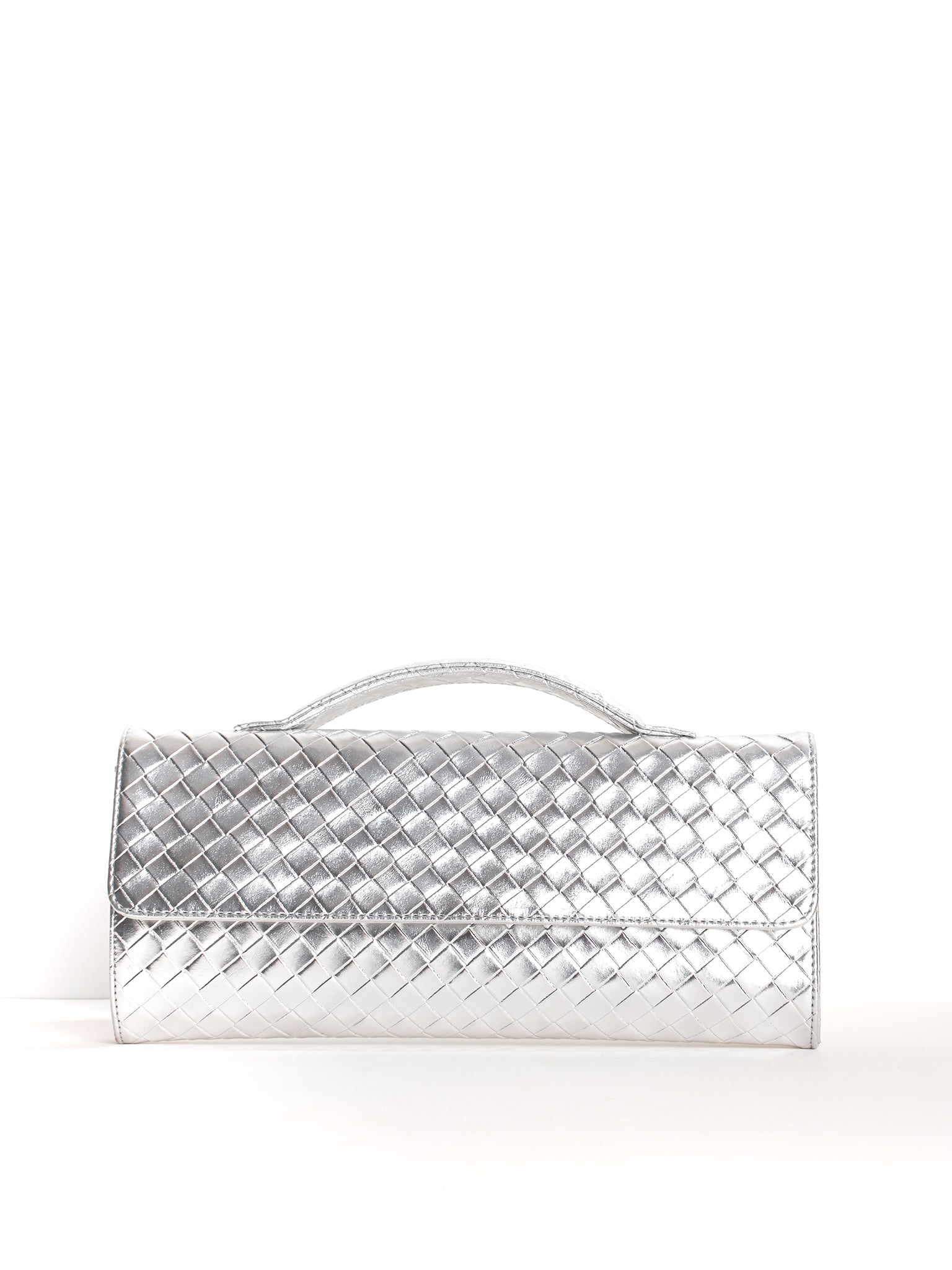 Chic and structured — the Valentina Clutch pairs a metallic silver woven finish with a sleek top handle for a timeless look. Light yet bold, it’s your go-to piece for evening elegance or a standout night out.